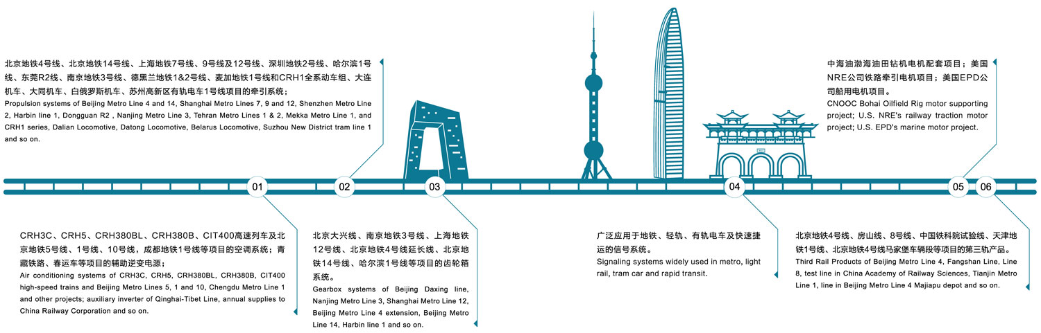 02.北京、上海、廣州、深圳、天津、成都、哈爾濱、南京、烏魯木齊、蘭州、廈門、東莞、佛山等20個國內城市,和德黑蘭、麥加、曼谷等海外城市的地鐵,以及CRH1全系列動車組,大連、大同、白俄羅斯機車,南京、蘇州有軌電車,上海自動捷運系統,蕪湖單軌項目的車輛牽引系統;